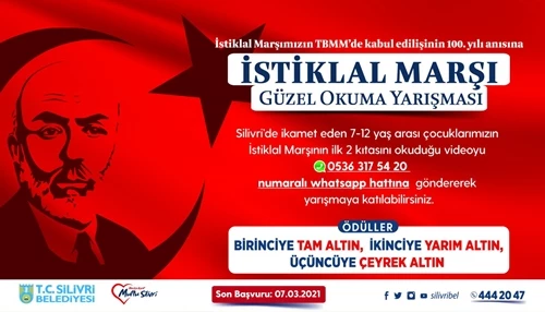 Silivri Belediyesi özgürlük, bağımsızlık ve Milli Mücadelemizin en önemli simgelerinden birisi olan ve milli şairimiz Mehmet Akif Ersoy tarafından yazılan İstiklal Marşımızın TBMM'de kabulünün 100. yıl dönümü dolayısı ile "İstiklal Marşı'nı Güzel Okuma Yarışması" düzenliyor. Sadece Silivri'de ikamet eden 7-12 yaş arası çocukların katılabileceği yarışmada birinciye tam altın, ikinciye yarım altın, üçüncüye ise çeyrek altın ödül verilecek. Yarışamaya katılmak isteyenler İstiklal Marşı'nın ilk 2 kıtasını okudukları videolarını ad- soyad bilgilerini yazarak 0536 317 54 20 numaralı whatsapp hattına 7 Mart 2021 Pazar günü saat 17.00'ye kadar gönderebilirler.