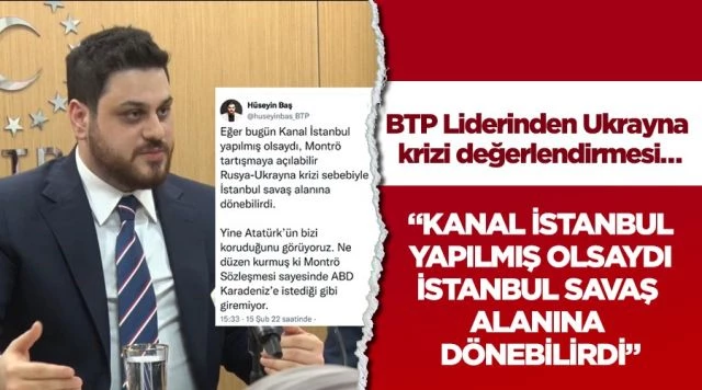 BTP Genel Başkanı Hüseyin Baş;dikkat çekici Ukrayna krizi değerlendirmesi yaptı.Dünyanın kilitlendiği Ukrayna krizine Bağımsız Türkiye Partisi’nden (BTP) dikkat çekici bir değerlendirme geldi.Kanal İstanbul Projesini ve Montrö Boğazlar Sözleşmesi’ni hatırlatan BTP Genel Başkanı Hüseyin Baş, ABD ile Rusya arasındaki çekişmeye atıfta bulunarak, “Bugün Kanal İstanbul yapılmış olsaydı, Montrö tartışmaya açılabilir, Rusya-Ukrayna krizi sebebiyle İstanbul savaş alanına dönebilirdi” dedi.