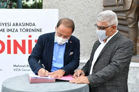 Emekçinin her zaman yanında olan ve haklarını öncelikli tutan Beylikdüzü Belediyesi, KESK’e bağlı TÜM-BEL-SEN Sendikası ile Toplu İş Sözleşmesine imza attı. Belediye binası önünde gerçekleşen törene Beylikdüzü Belediye Başkanı Mehmet Murat Çalık ve Tüm BEL-SEN Genel Başkanı Erdal Bozkurt’un yanı sıra Belediye Başkan Yardımcıları, Belediye Birim Müdürleri ve emekçi belediye personelleri de katıldı. Törende günün anlam ve önemine ilişkin konuşma yapan Genel Başkan Bozkurt, “Cesaretli, yüreği emekten yana akan yöneticiler işin başına geldiği zaman hayat değişip güzelleşebiliyormuş onu gördük. Pandemi koşullarına rağmen başta Belediye Başkanımız Mehmet Murat Çalık olmak üzere bizi bir araya getirip emeği geçen herkese çok teşekkürler. Gerçekten çok önemli ve değerli bir iş yapıyoruz. Bugün belki çok fark edilmeyecek ama gelecekte tarihe not olarak düşülecek işlerden biridir” şeklinde konuştu.