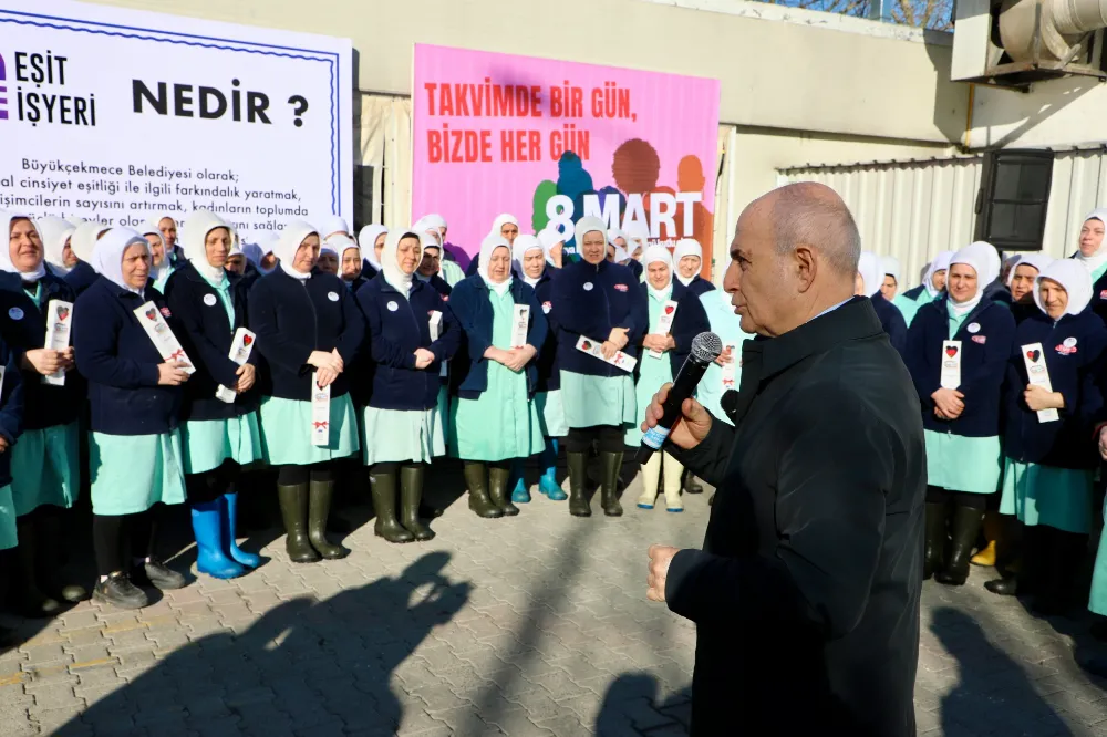 ‘’Eşit İşyeri Projesi’’ kapsamında çalışan kadın ve erkek sayısı eşit olan bir konserve fabrikasına “Eşit İşyeri” belgesini takdim eden Büyükçekmece Belediye Başkanı Dr. Hasan Akgün, bütün kadınların 8 Mart Dünya Emekçi Kadınlar Günü’nü kutlayarak şu açıklamayı yaptı: ‘’Bugün Dünya Kadınlar Günü. İlçemizde bir iş yerinde kadınlarımızın Dünya Kadınlar Günü’nü kutladık ve ‘’Eşit İşyeri Projesi’’ni onlara anlattık. Dünya Kadınlar Günü’nü herkes biliyor. Kadınların hak mücadelesi sonucu hak ettikleri bir bayramdır. Bu mücadeleci bütün kadınlarımızı kutluyoruz ve çalışan kadınlarımıza sağlık, esenlikler diliyoruz. Bu iş yerinde çalışanların yüzde 70’inden fazlası kadın. Büyükçekmece Belediyesi’nin başlatmış olduğu bu proje ile iş yerinde çalışanların en az yarısı kadın olduğu takdirde iş yerinin belediyeye ödemiş olduğu ilan, reklam vergisi ve çeşitli vergilerin, çeşitli harçların yüzde 50’si siliniyor. Amacımız iş yerlerinde çalışan kadın sayısını artırmak, cinsiyet eşitliğini sağlamaktır. Bu nedenle kıymetli arkadaşımı kutluyorum ve bu ‘’Eşit İşyeri’’ ödülünü de kendilerine takdim ediyorum. ‘’